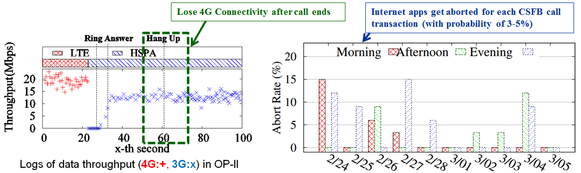 | S5: PS rate declines (e.g., 96.1% in US-II) during ongoing CS service. | Operation | 3G-RRC, CM, SM | Cross-domain | 3G-RRC configures the shared channel with a single modulation scheme for both data and voice. | |