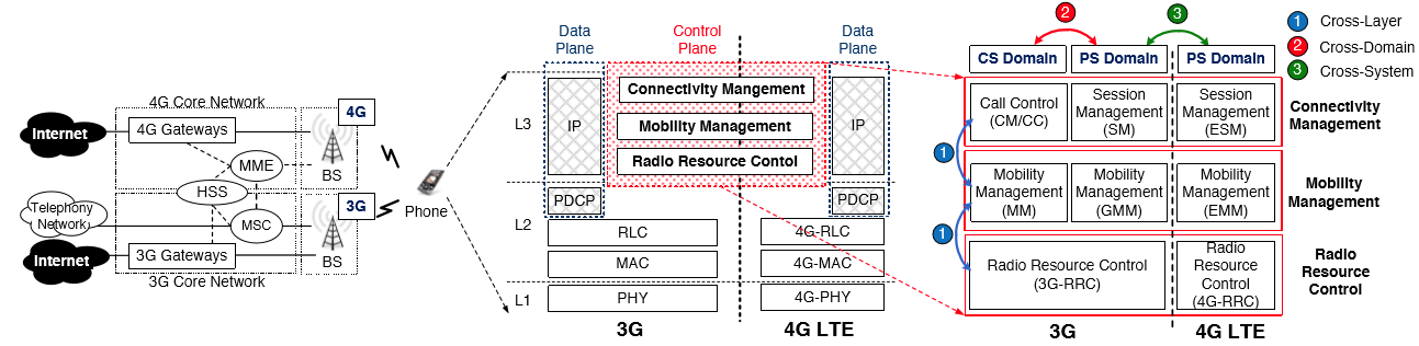| Necessary but problematic cooperations | S1: User device is temporarily ?out-of-service? during 3G-to-4G switching. | Design | SM/ESM, GMM/EMM | Cross-system (3G, 4G) | Cross-system states are shared but unprotected between 3G and 4G; States are deleted during inter-system switching. |