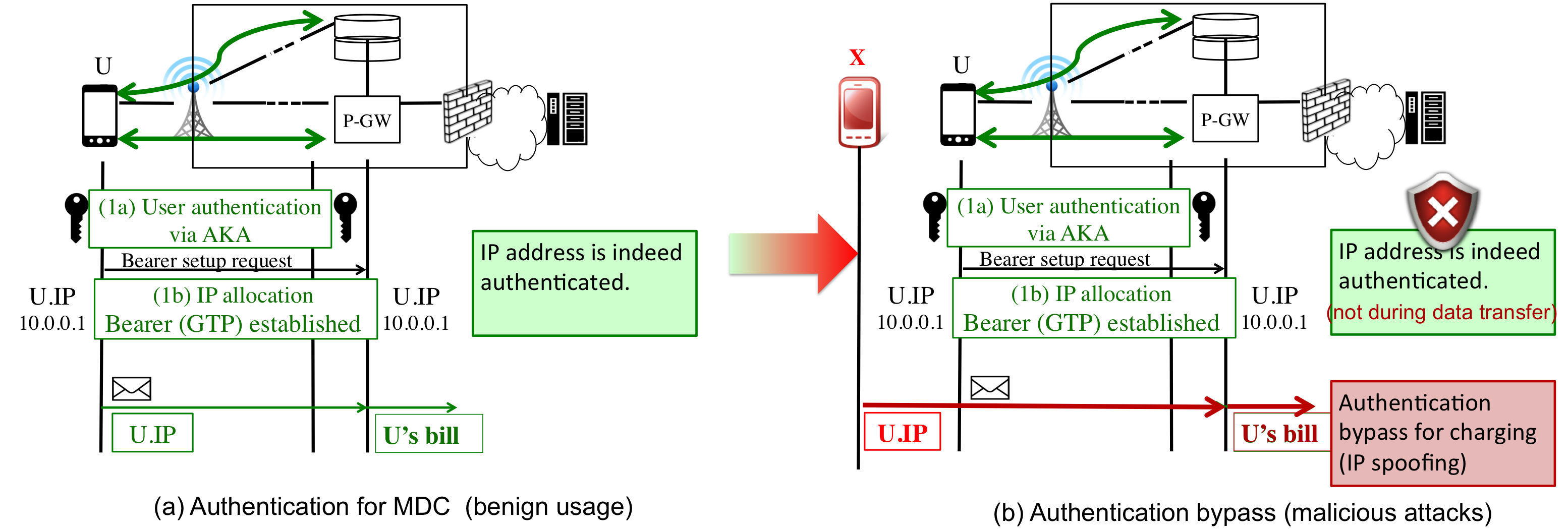 L1. authentication bypass:authentication for MDC counts on inherent user authentication and IP address allocation. It indeed ensures that IP address is allocated to an authenticated, specific user. However, the current practice may not ensure its secure binding with its mobile charging ID, so that MDC may use a wrong IP address to determine who should be charged. A specific violation is that IP spoofing was allowed in real 4G/3G networks and some carriers used the spoofable IP address to determine who should be charged.