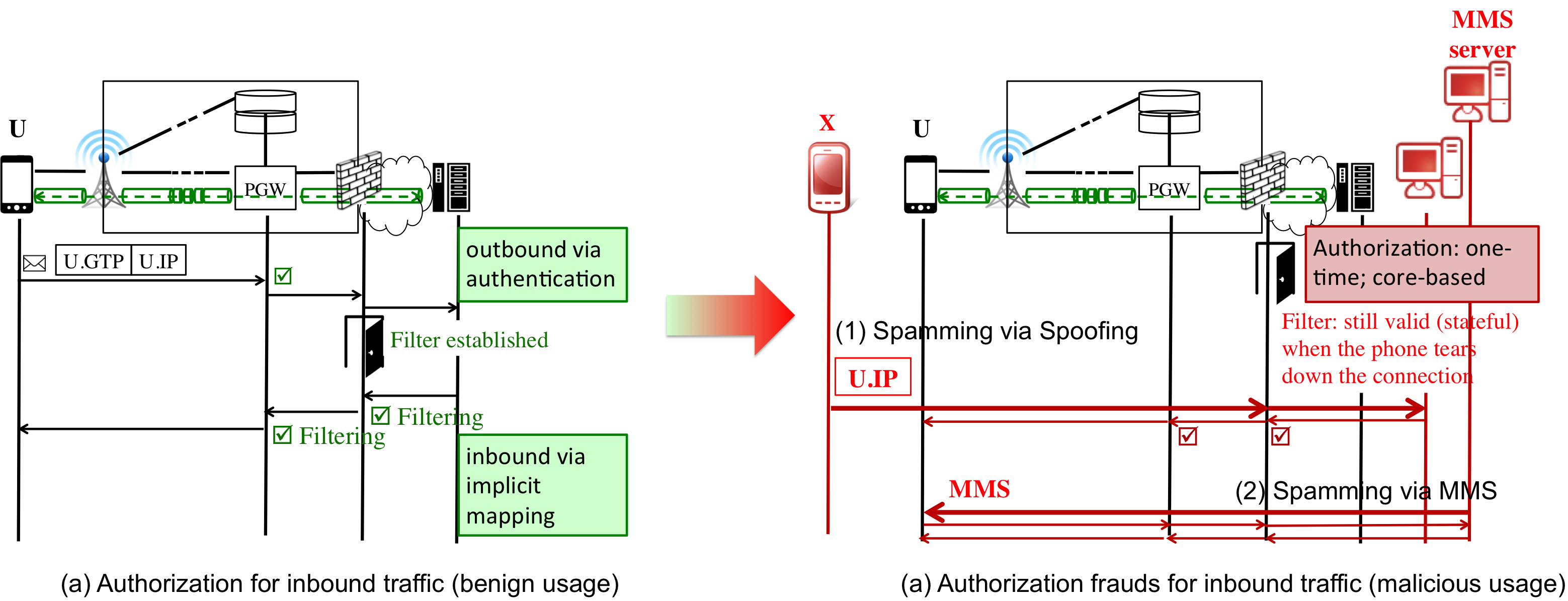 However, no proper authorization is in place for the inbound transfer. The current practice is to invoke onetime authorization only at the start, but apply soft-state renewal by data packets during actual transfer. For example, when an inbound packet arrives at NAT, the mapping between its IP address and the port number remains valid until timeout (e.g., 5 minutes). However, once the access is granted, it is largely beyond user control. By exploit the ?non-expiring authorization,? as illustrated in Figure 2(b), the attacker can inject spamming packets to the victim device. In this process, we make use of popular mobile applications (e.g., VoIP, MMS) that allow push-based communication model and perform automatic background operations. This feature can also be exploited to trap the victim. Here, we disclose two examples using IP spoofing and MMS. More examples can be found in our previous CCS'12 work.