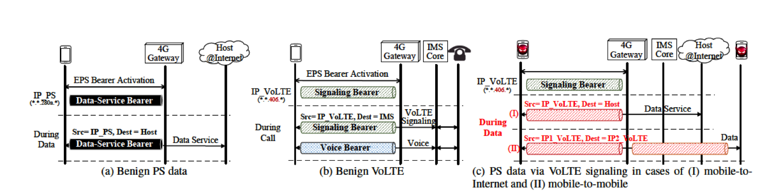 VoLTE makes it possible to carry data packets over VoLTE signaling channel. While VoLTE intends to use PS packets to carry signaling messages, it is never forbidden from turning PS data into VoLTE (signaling). Similar to the data service that retains a bearer (i.e., IP connectivity), VoLTE also has a signaling bearer for its control-plane operation. As shown in Figures 2a and 2b, both need to first activate a bearer and obtain an IP connectivity within the LTE network. Afterwards, data packets can be delivered through this bearer once any service starts. The device sets the source address as that allocated by the 4G Gateway and the destination as the target host?s. For VoLTE, upon any call request, SIP messages are exchanged between the device and the IMS core through the signaling bearer. It then on-demand invokes a voice bearer to carry conversation traffic if the call is accepted. When the call ends, the voice bearer is released. With the packet-carrying capability, it is feasible to carry any data through the VoLTE signaling bearer under two vulnerabilities. First, on the device side, there is no access control to prevent non- VoLTE packets from being injected into the signaling bearer. Second, on the network side, these injected packets are allowed to pass by (e.g., routed to the destination by the 4G gateway). This has been validated in two tier-1 US carriers. Moreover, with a distinct charging model, voice signaling messages are free and thus PS data over VoLTE signaling is free of charge! Unsurprisingly, the VoLTE-exploited data access can obtain higher, yet underserved priority. This is because the high priority is assigned to provide QoS for VoLTE. This hurts normal PS data services, particularly during network congestion. Similarly, on VoLTE voice bearer, junk packets can be injected to overwhelm the bearer and thus mute the ongoing calls.